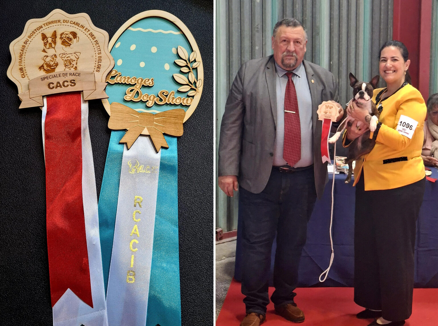 Gloria si è classificata 4/16 alla National d’èlevage du club français du Boston Terrier e alla Gara Speciale Boston Terrier aprendo con 1 punto e mezzo il campionato francese. Orgogliosa di lei, una femmina di piccole dimensioni ma che si è fatta subito apprezzare per struttura e movimento.
